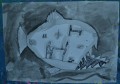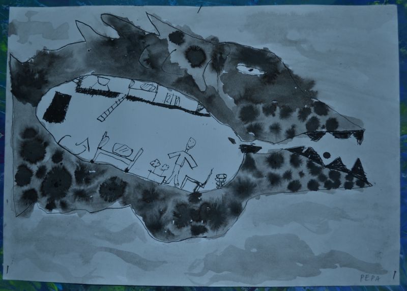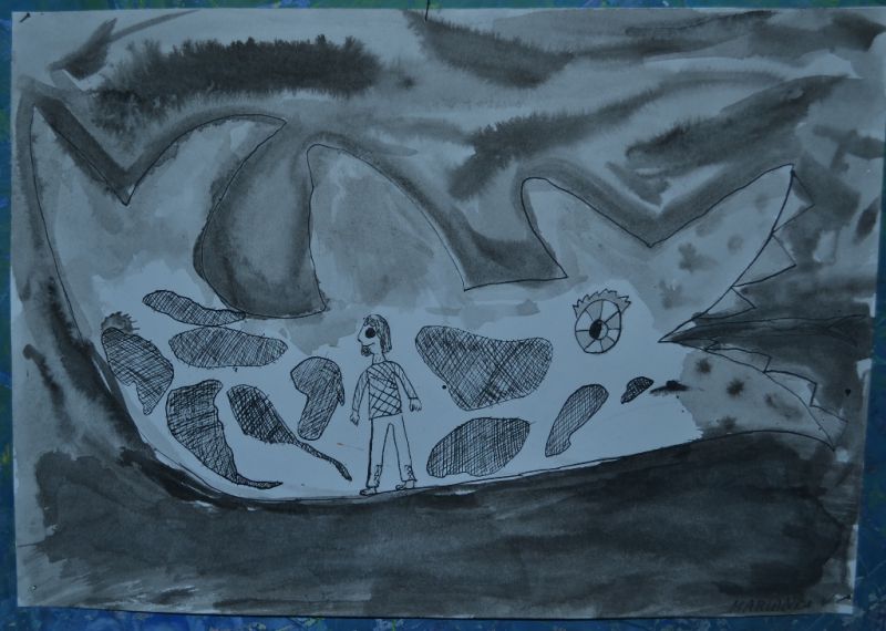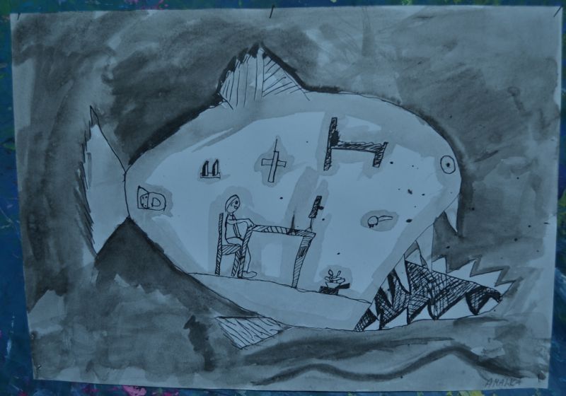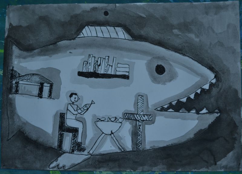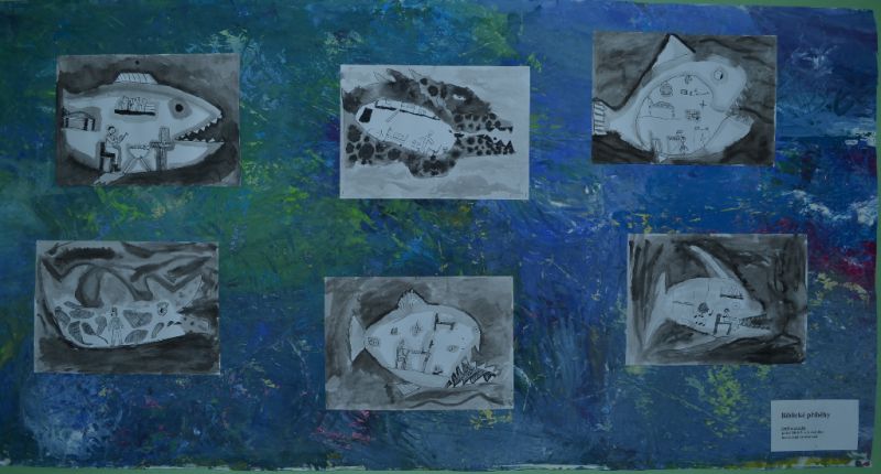 Jonáš a velryba - lavírovaná kresba tuží - práce žáků 2. a 3. ročníku