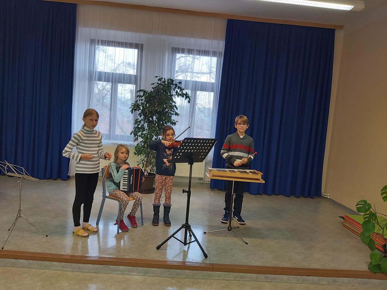 Šarlotka, Eliška (p. uč. P. Strašáková), Klárka a Honzík spolu hrají písničku