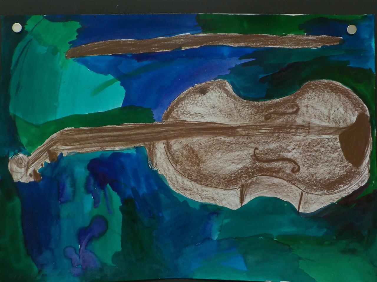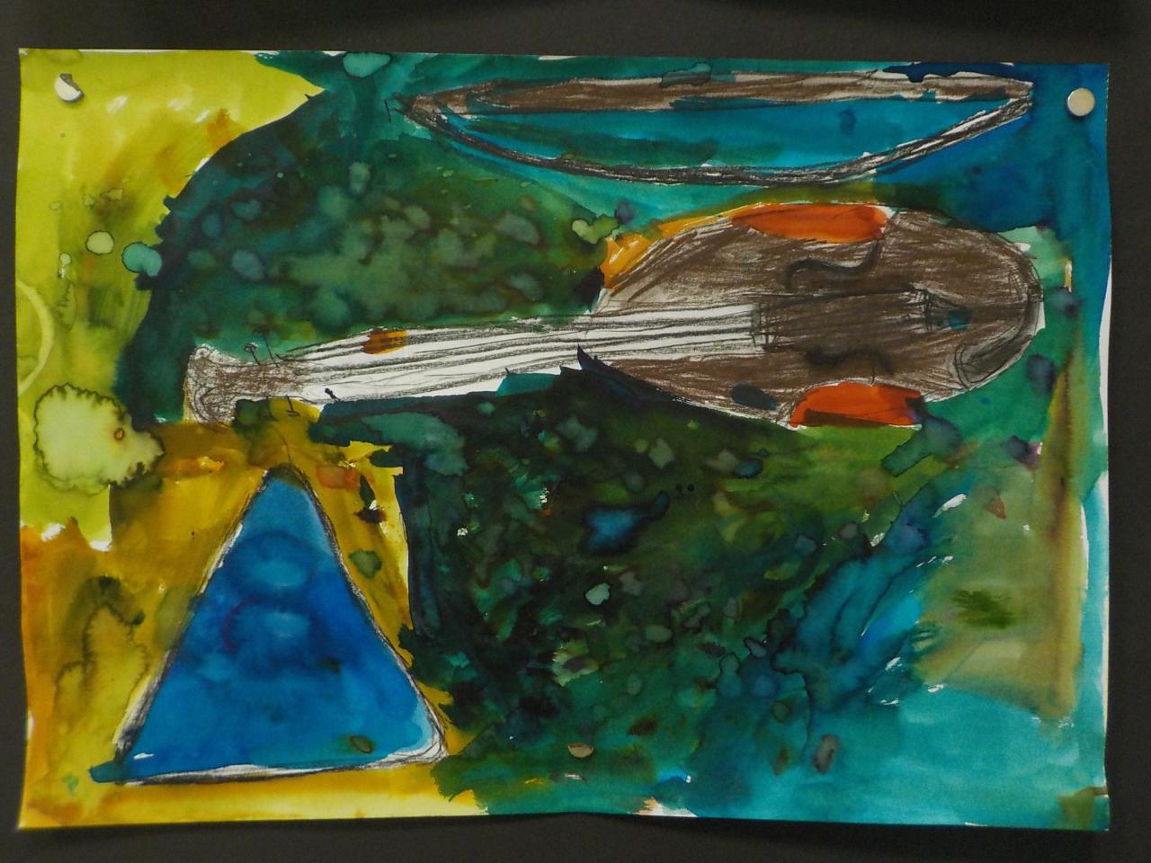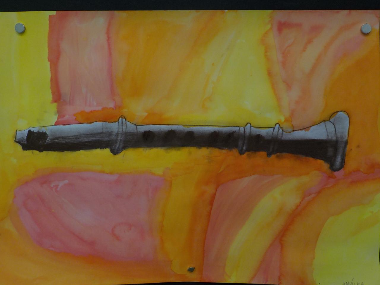 studijní kresba podle skutečných hudebních nástrojů, v pozadí zachycení hudebního dojmu vodovými barvami