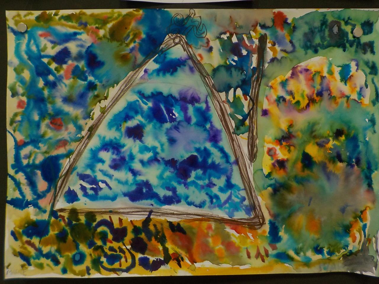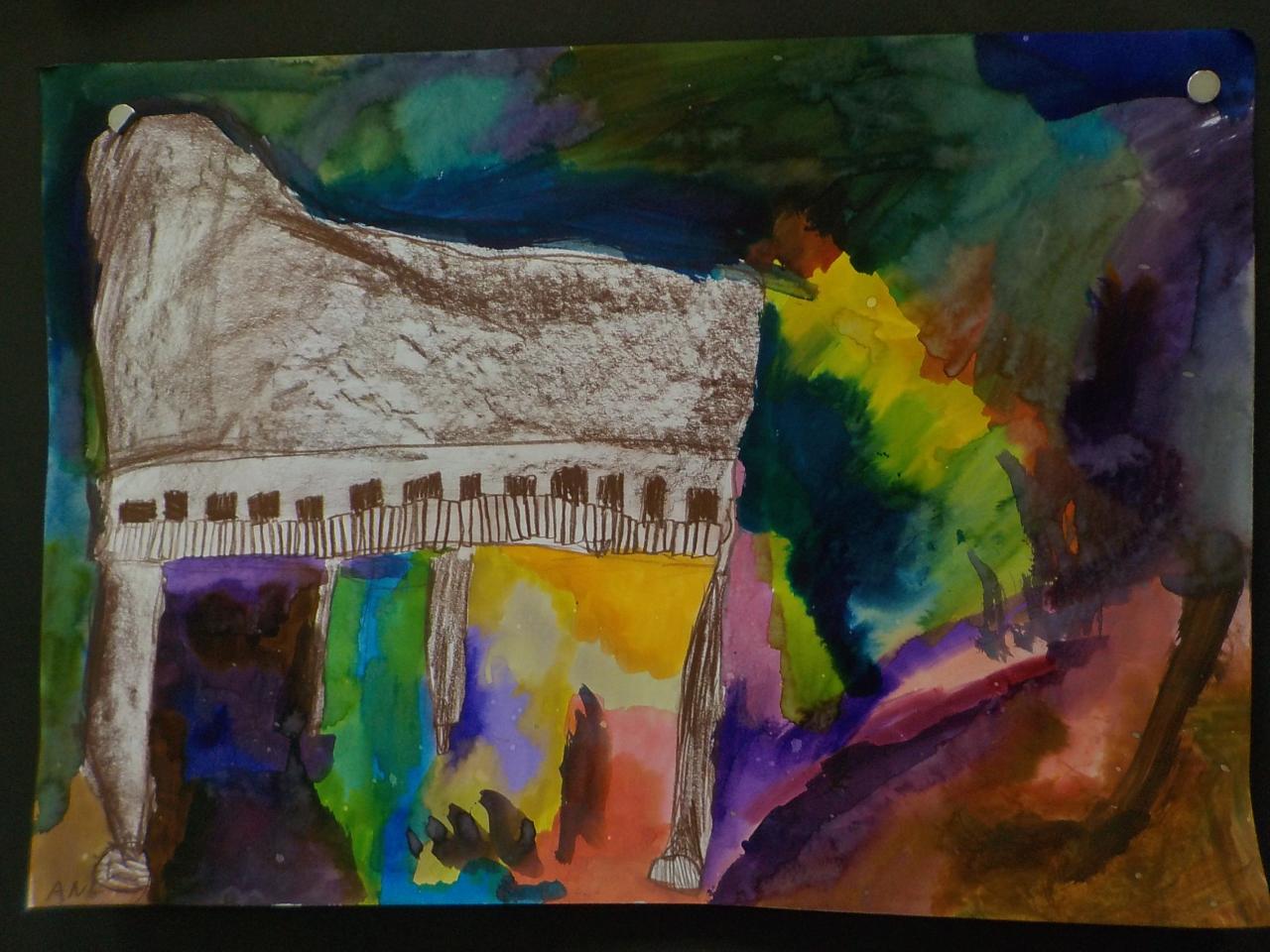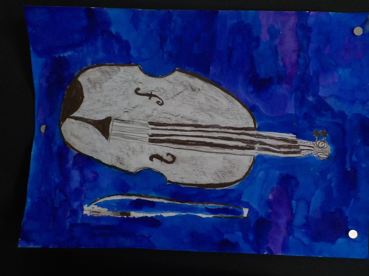 studijní kresba podle skutečných hudebních nástrojů, v pozadí zachycení hudebního dojmu vodovými barvami
