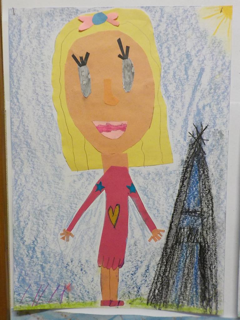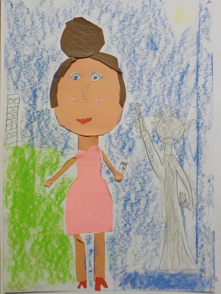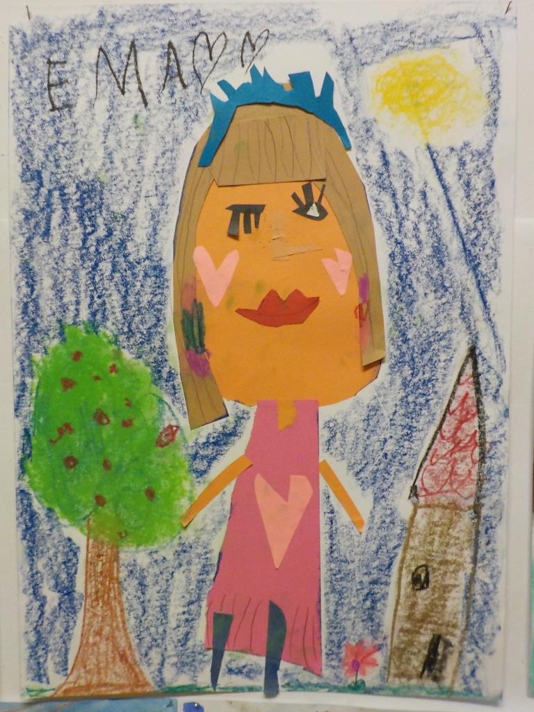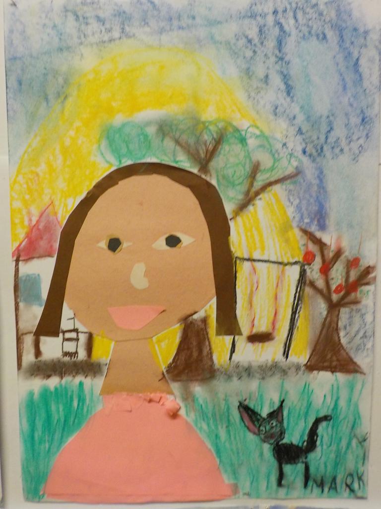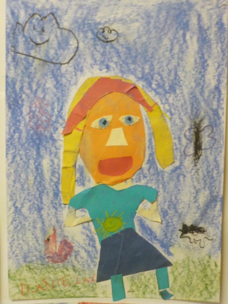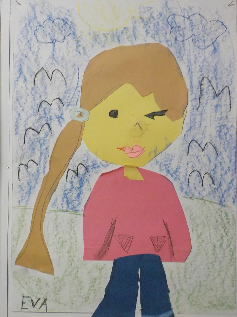 hra s barevnými papíry - stříhání, lepení - doplněná kresbou suchým pastelem