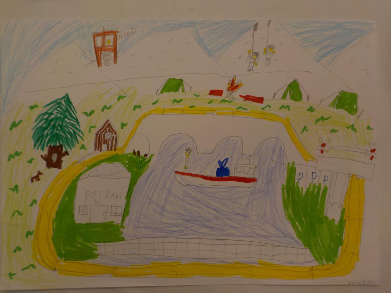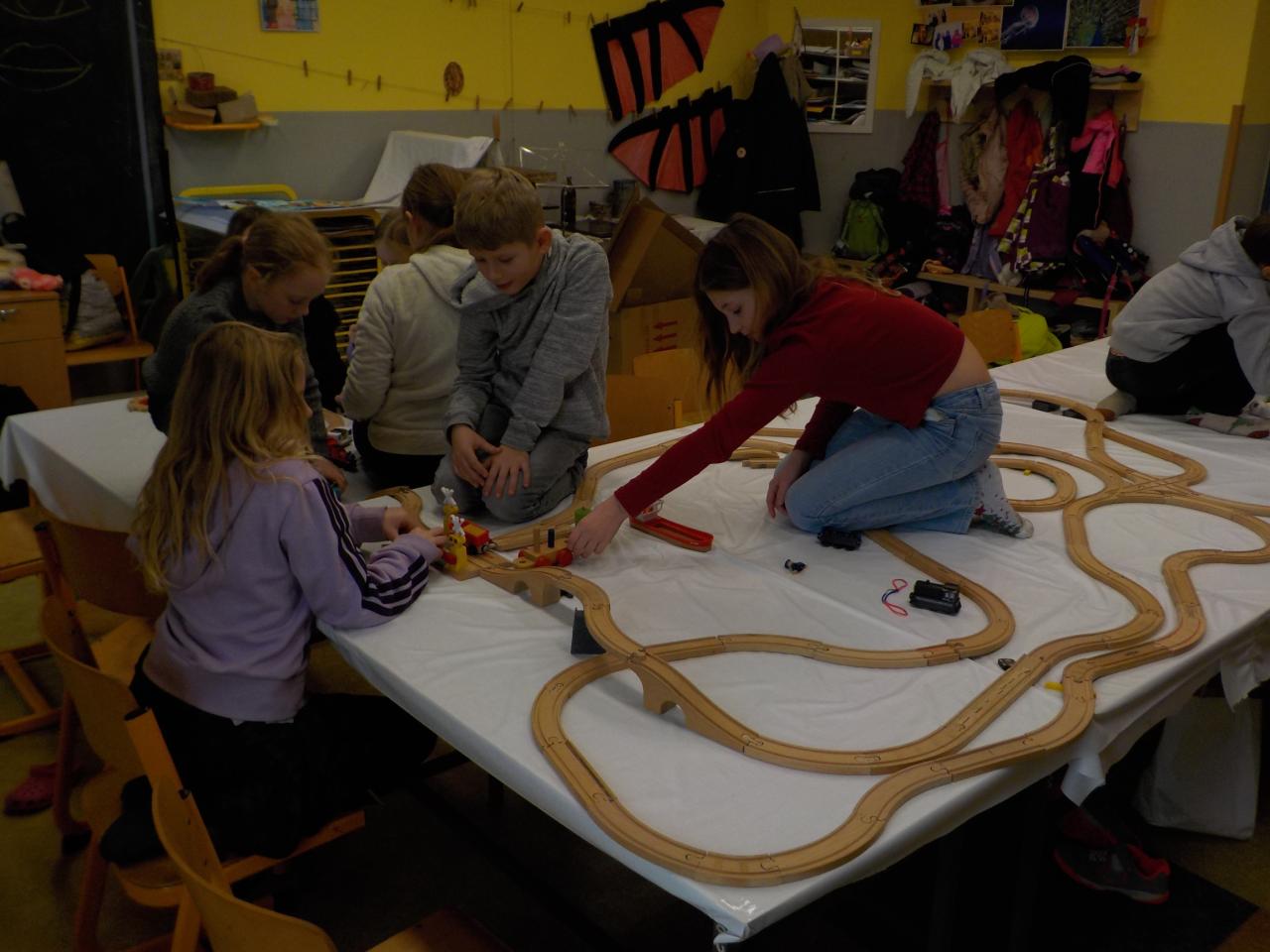 Společné stavění dráhy a mostů a zachycení vybrané části na papír tužkou, pastelkou, fixou; reálná kresba doplněná prostředím podle fantazie, zaměření se na detail