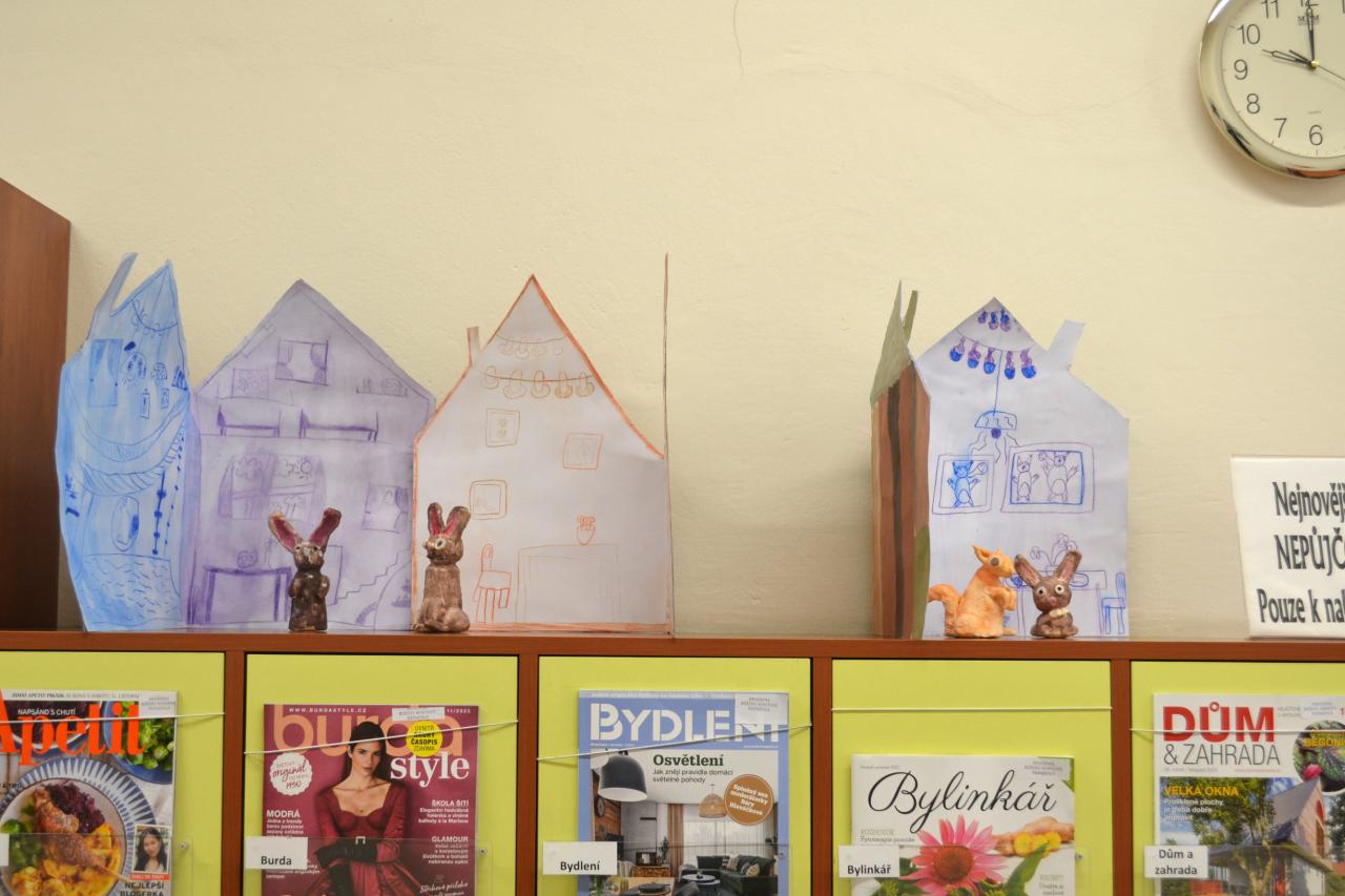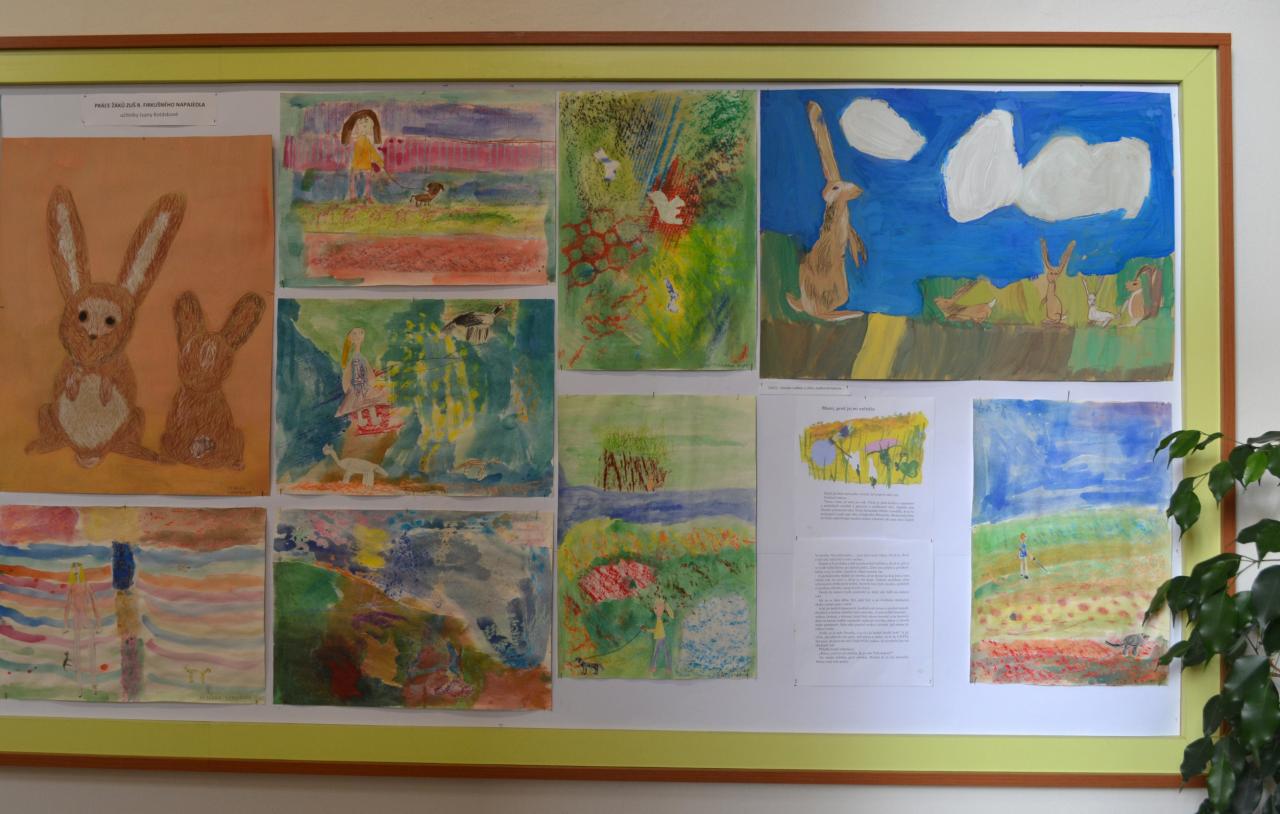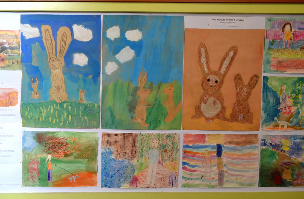K vidění jsou výtvarné práce mladších dětí, které děti vytvořily v Napajedlech a na odloučeném pracovišti v Babicích pod vedením učitelky Ivany Kotáskové. Na výstavě se seznámíte se zajíčkem Jácíčkem a veverkou, jeho kamarádkou.